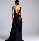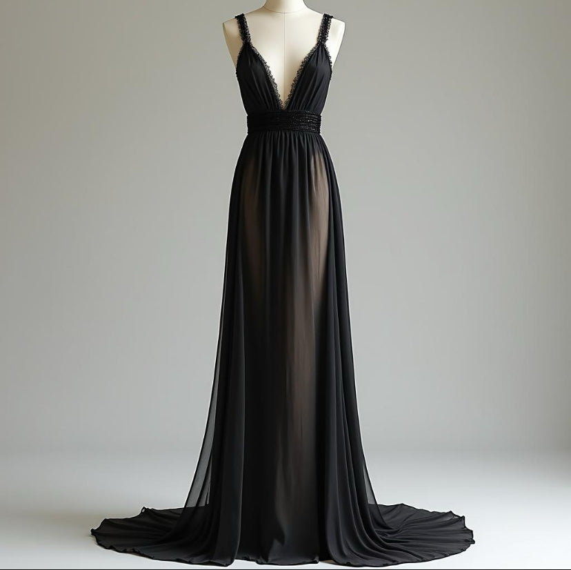 This is a bohemian wedding gown or evening dress that perfectly combines gothic elegance with boho-inspired design. Crafted from premium black breathable silk chiffon, this dress offers both sophistication and a bold, enchanting aesthetic ideal for brides seeking a unique wedding look.