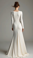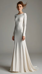 The SANTORINI dress is a stunning bridal gown crafted from crepe, designed to combine elegance with a minimal charm. Featuring a long-sleeve silhouette and a closed or an open back, this wedding dress beautifully balances a modest front with a seductive, ethereal style.